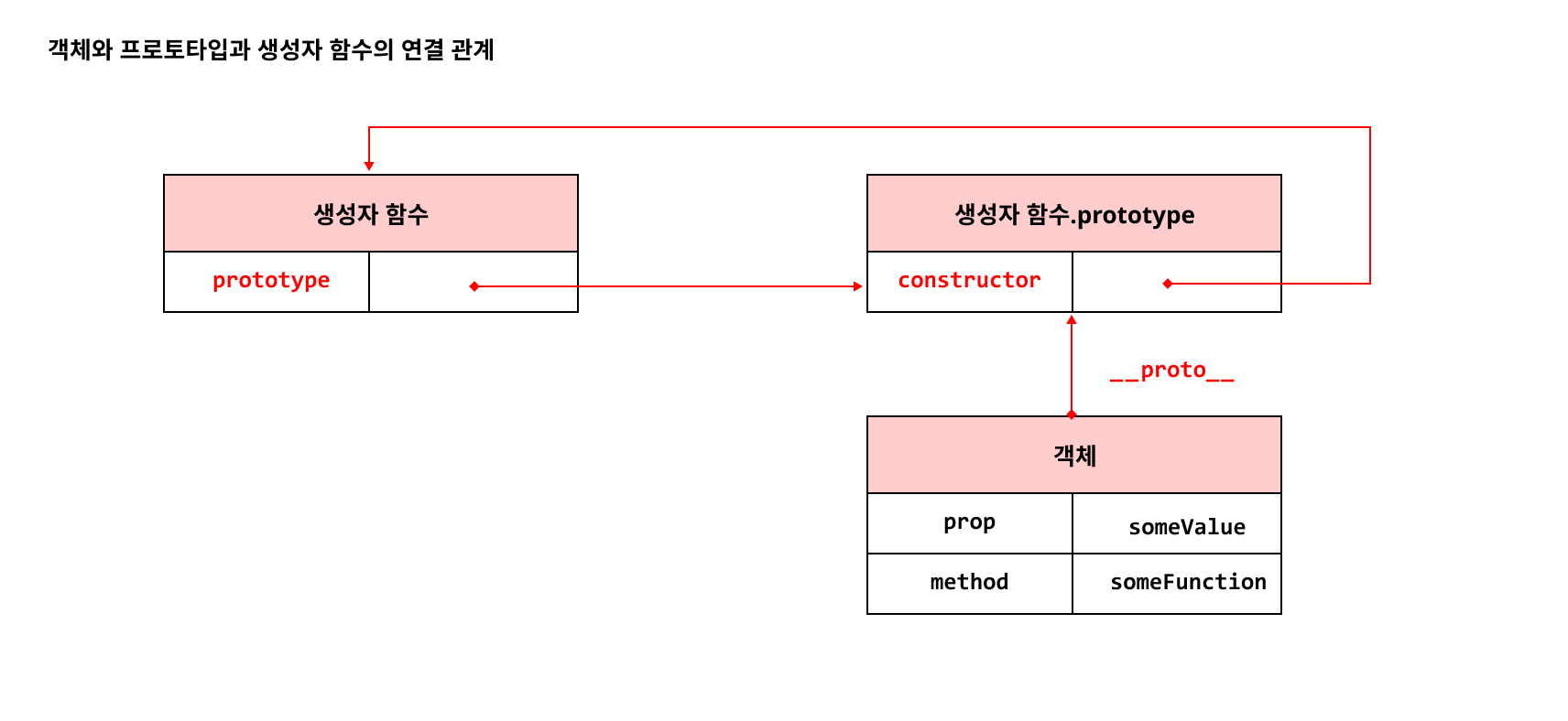 __proto__: 모든 객체가 사용, 객체가 자신의 프로토타입을 get/set 하기 위해서- prototype property : 생성자 함수가 사용, 생성자 함수가 자신이 생성할 객체(인스턴스)의 프로토타입을 할당하기 위해서
