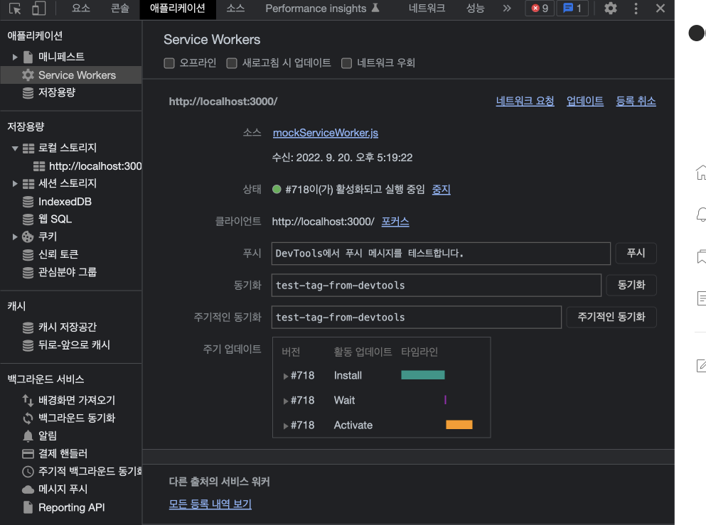 이때 devtools>application>serciveWorker를 확인해 보면 서비스워커의 동작을 볼 수 있다.