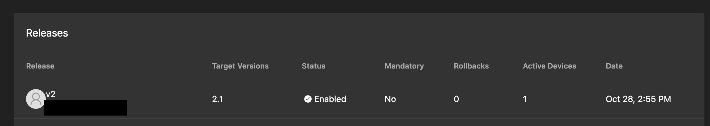 appcenter codepush deployment list -a 사용자이름/앱이름 --displayKeys