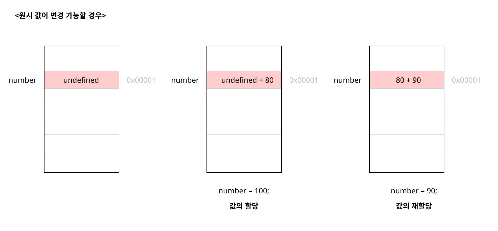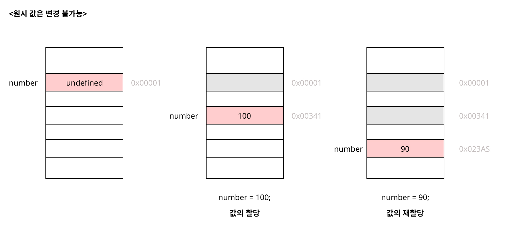 원시 값을 할당한 변수에 새로운 원시 값을 할당한다면, 새로운 메모리 공간을 확보하고, 재할당한 원시 값을 저장한 다음, 변수는 새롭게 재할당된 값을 가리킨다. 즉, 변수가 참조하던 메모리 공간의 주소가 바뀐다. 메모리 공간에 저장되어 있던 값이 변경되는 게 아니다!