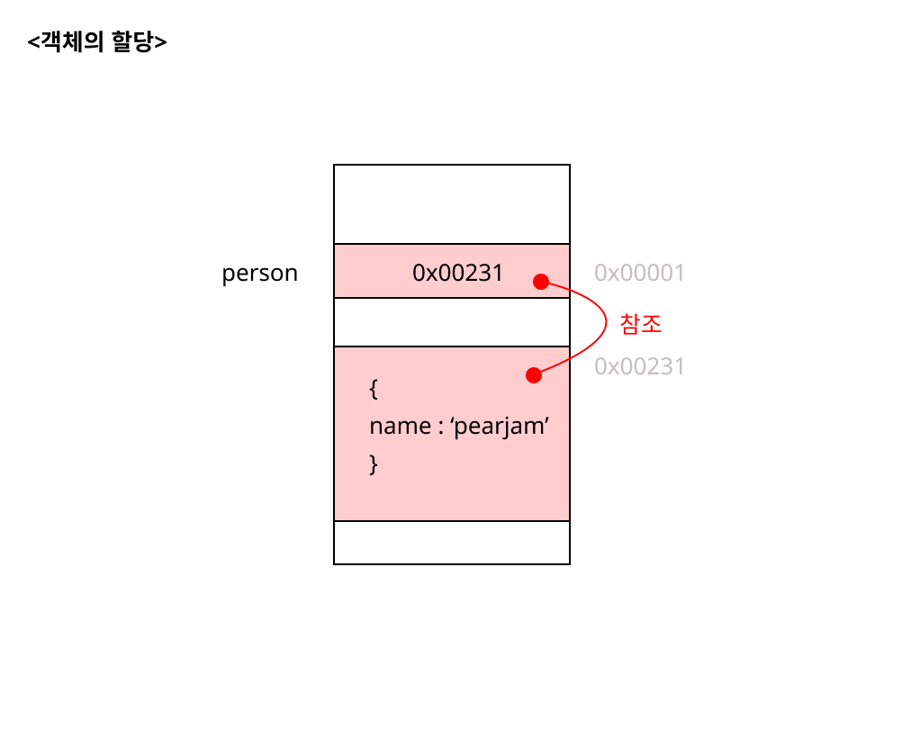 객체를 할당한 변수가 기억하는 메모리 주소를 통해 메모리 공간에 접근한다면 참조 값(reference value)에 접근할 수 있다. 객체를 할당한 변수에는 생성된 객체가 실제로 저장된 메모리 공간의 주소가 저장되어 있다.