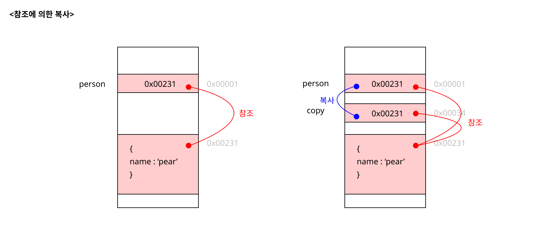 그러나, 원시 값과 다른 점은 원본에 참조 값이 복사되어 전달된다. 즉, 그림으로 보면 다음과 같다.